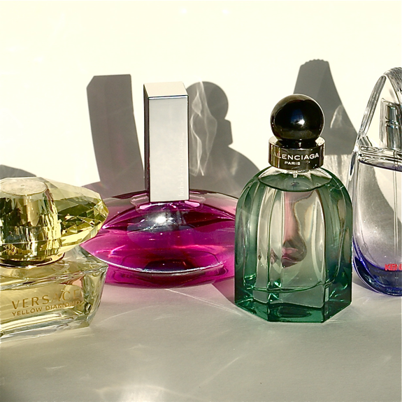 Versace Yellow Diamond (floral), Calvin Klein Forbidden Euphoria (fruity floral), Balenciaga L’Essence (floral green) en Madly Kenzo! by Kenzo (oriental floral). Alle vier de parfums zijn totaal verschillend, wat je ook kunt zien aan de diversiteit van de flacons. De volgende keer als jullie een parfumerie binnen wandelen, probeer dan de geuren te voorspellen aan de hand van de flacons.